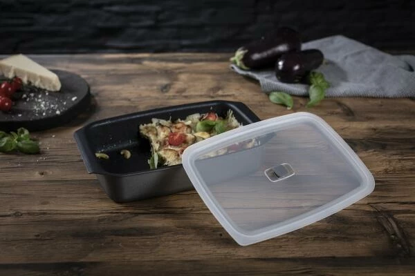 Dank des praktischen Kunststoffdeckels aus PP und Silikon können Aufläufe schnell im Kühlschrank oder in der Gefriertruhe verstauen werden! Ein Ventil im Deckel lässt Restwärme entweichen. Durch Runterdrücken entsteht ein leichtes Vakuum, welches Form und Deckel luftdicht miteinander verbindet.