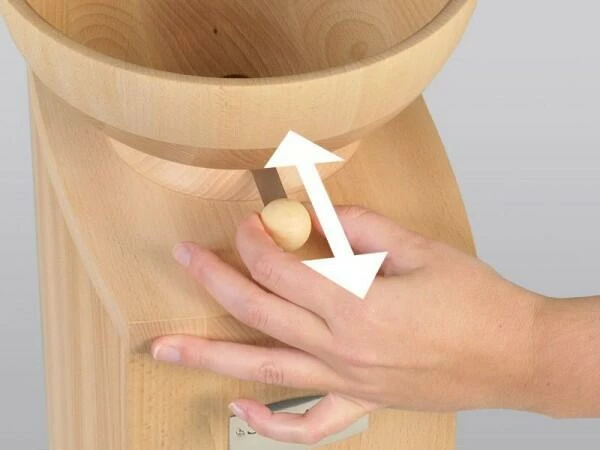 Der leichtgängige Einstellhebel ermöglicht eine stufenlose Bestimmung des Feinheitsgrades. Auf feiner Einstellung mahlt die Schnitzer Vario ca. 110 g Feinmehl je Minute, bei grober Einstellung ca. 300 g Schrot.